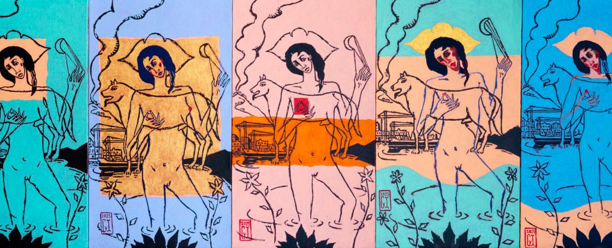 “5 versiones de la Venus de la perrocracia”, óleo sobre tela 58 x 166 cm (2025)